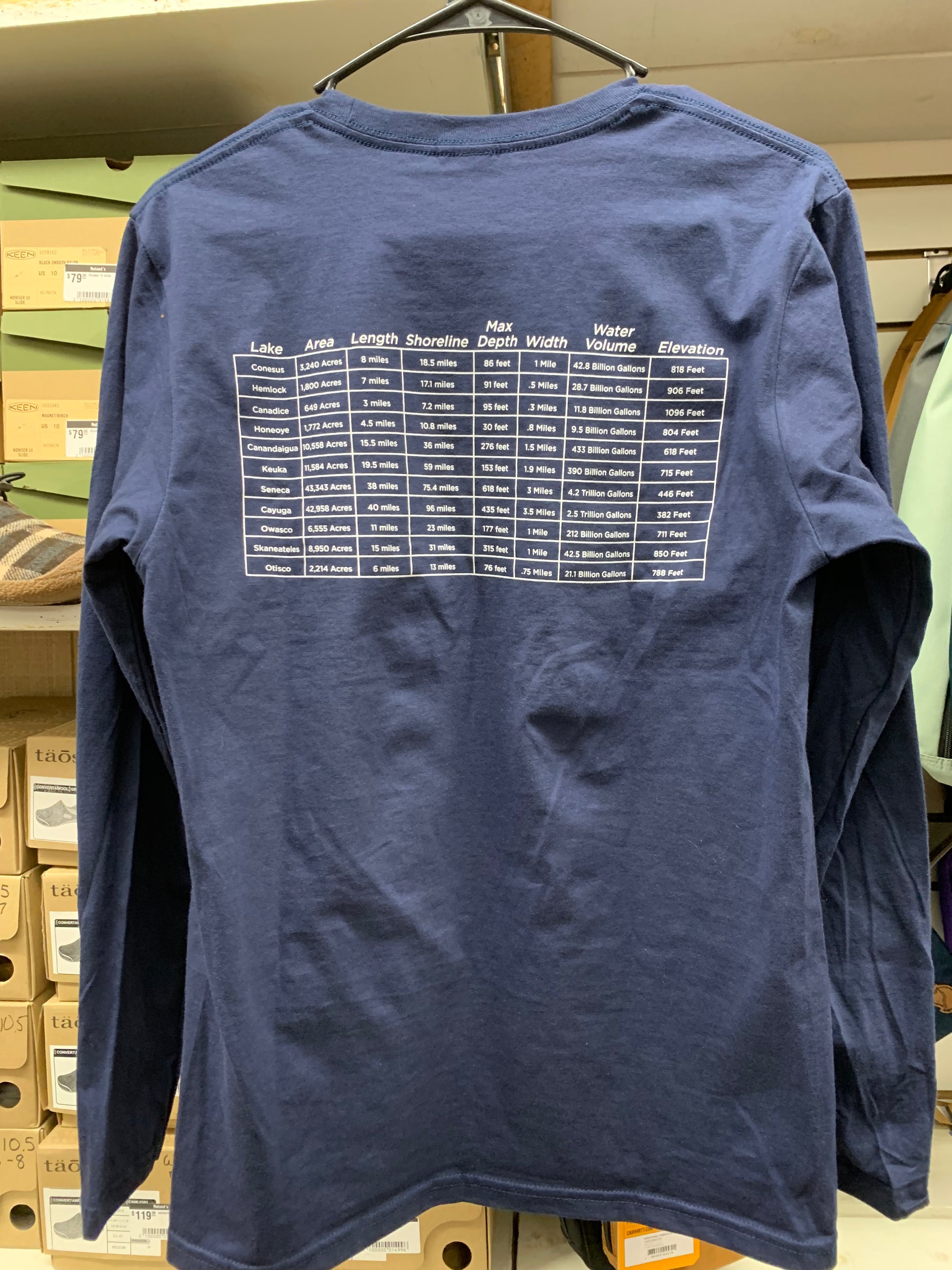 This long sleeve t-shirt depicts a map of all the Finger Lakes on the front of the shirt with stats of all the lakes on the back of the t-shirt. Made with 100% cotton