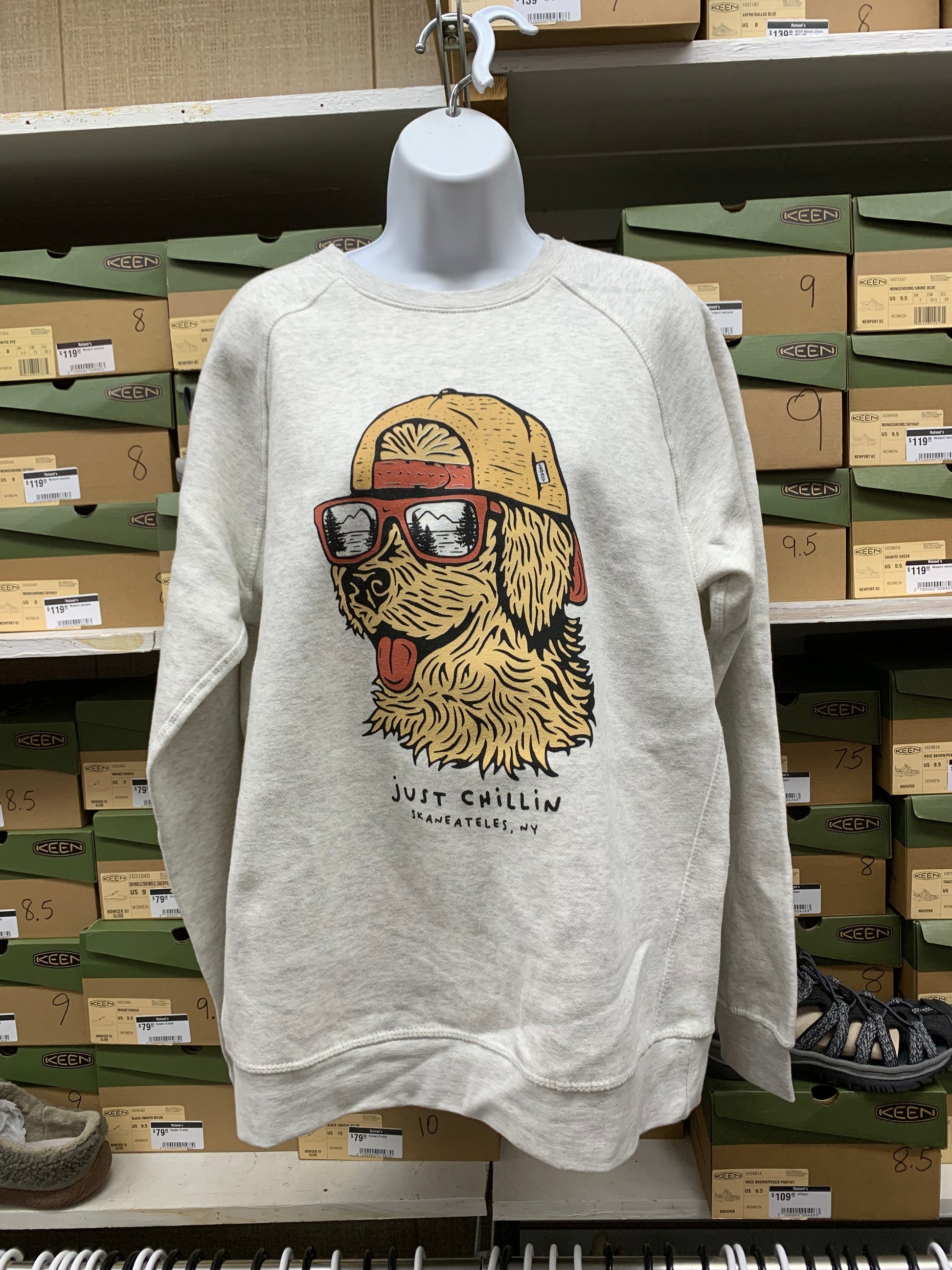 This crewneck sweatshirt from Ouray depicts a dog with sunglasses and a backwards hat with “just chillin” underneath. It’s a 65% cotton, 35% polyester blend.