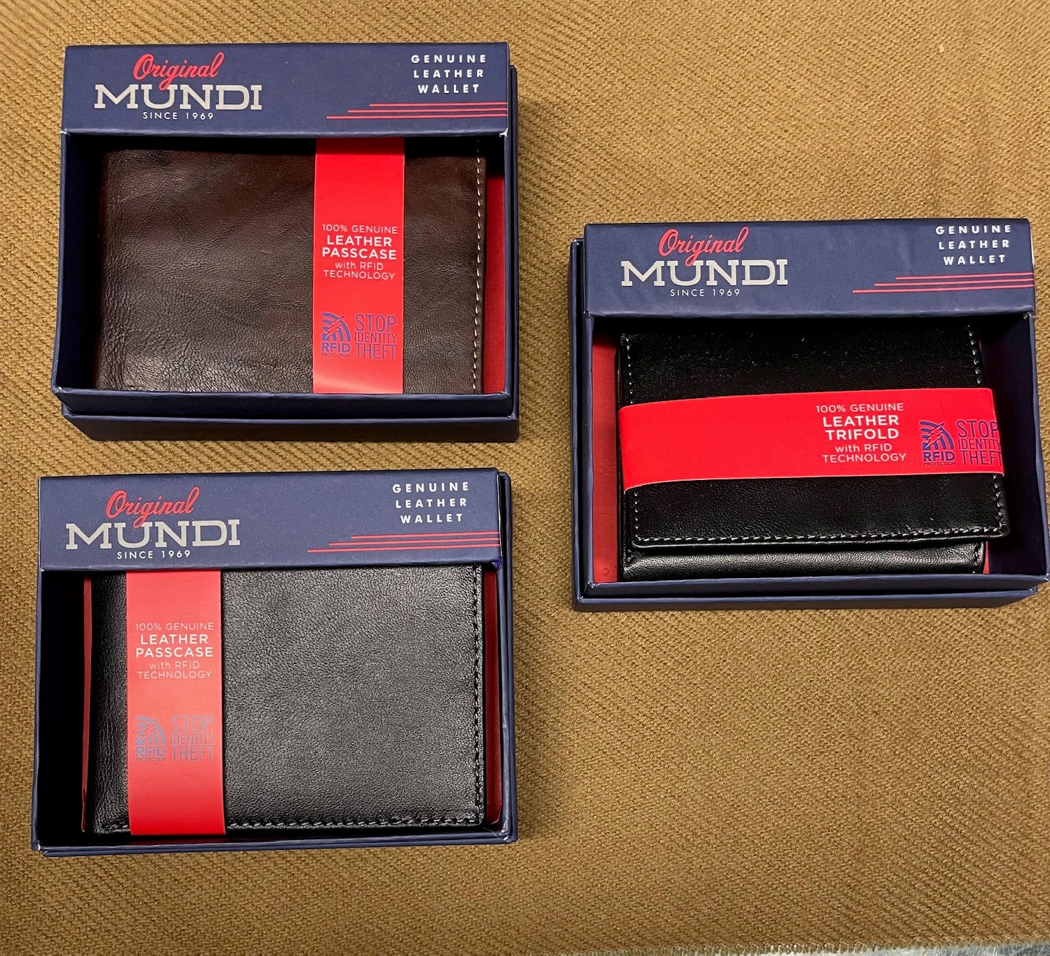 A leather wallet from Mundi, we carry 3 different styles; brown leather passcase, black leather passcase, and black leather trifold.