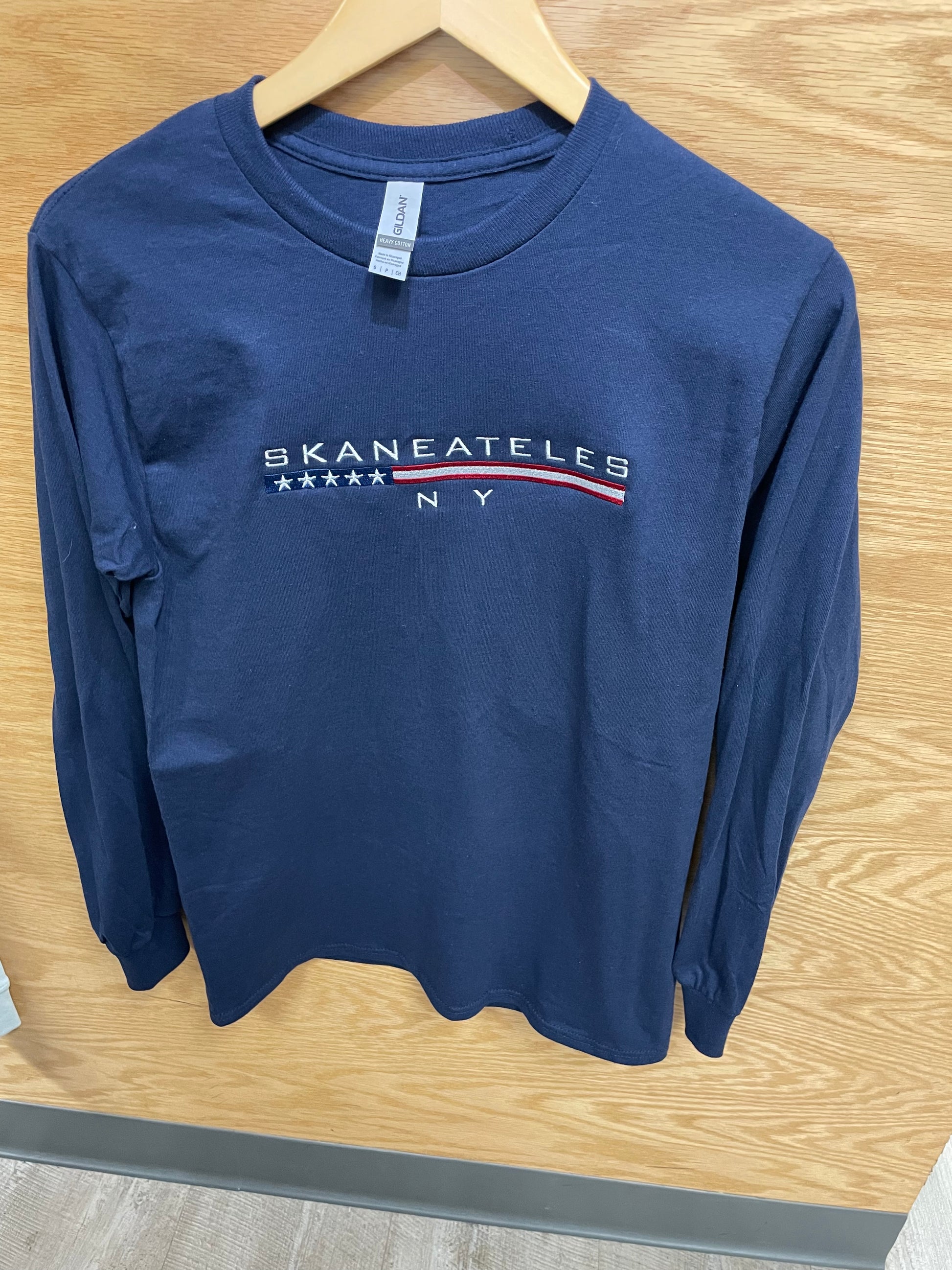 An embroidered long-sleeve T-shirt with a partial flag and Skaneateles across the front. Comes in navy.