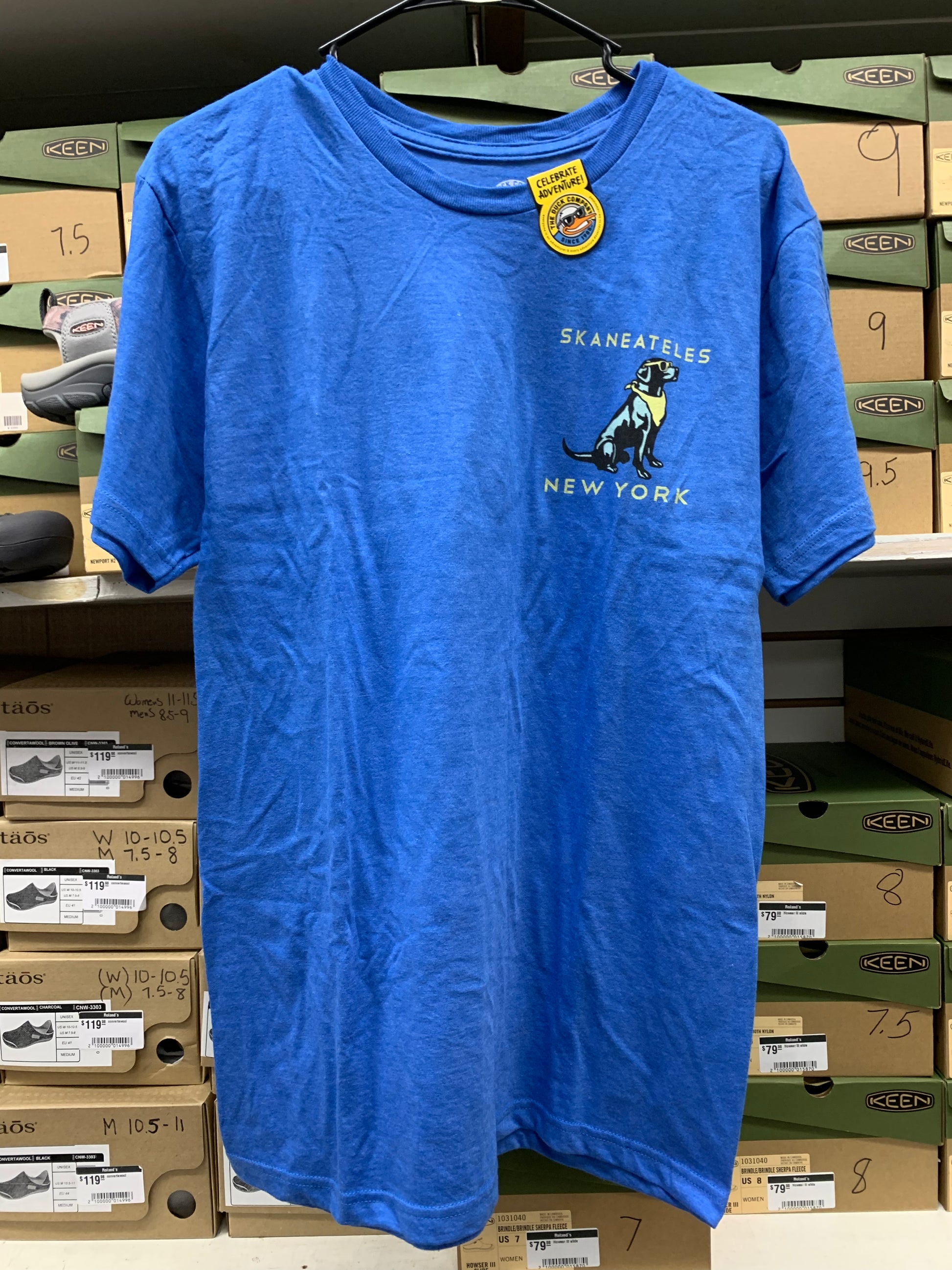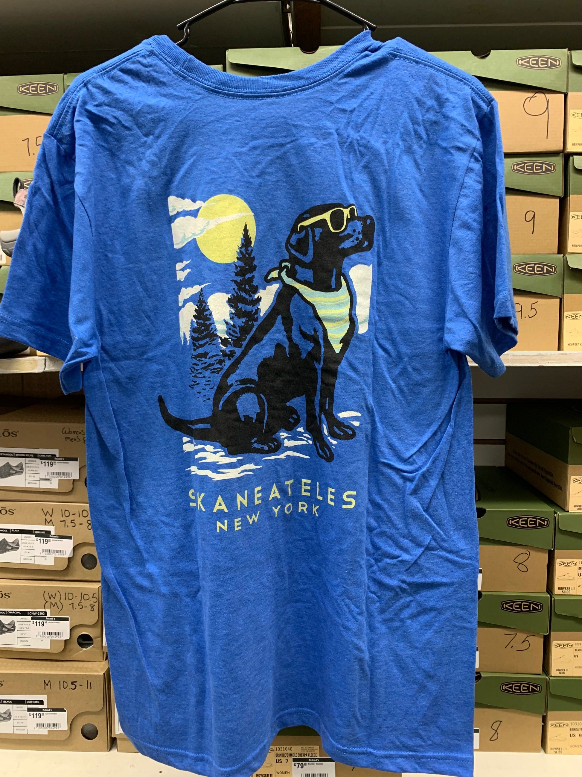 This t-shirt from The Duck Company is a 50% cotton, 50% polyester blend that has a front and back pattern of a dog with sunglasses on.