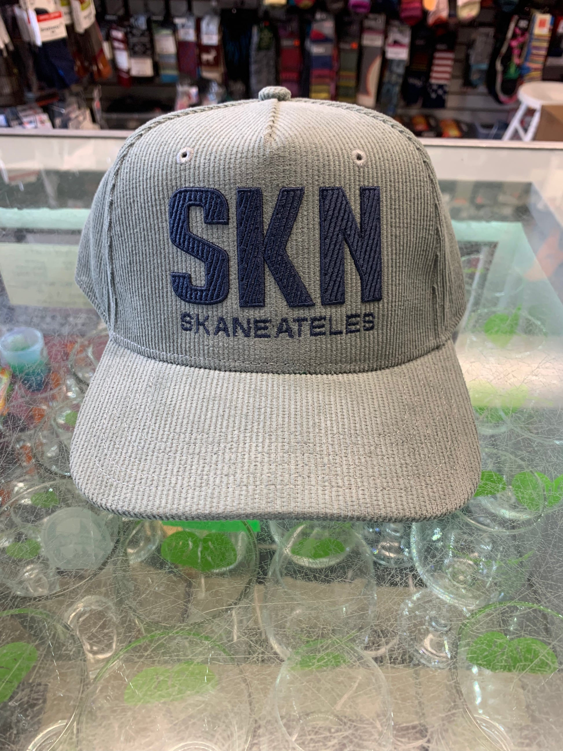 This adjustable snap back hat from Legacy has a corduroy fabric with SKN across the front.